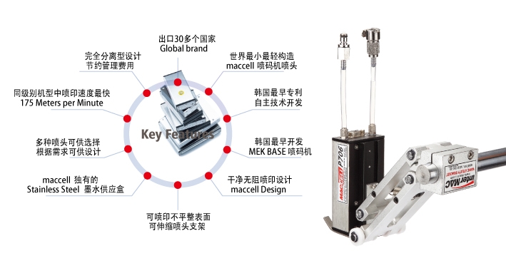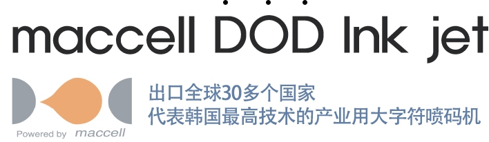- 100% 韩国专利生产,韩国最初被开发的大字符喷码机 maccell Drop on Demand (DOD) 。它代表韩国最新技术的产业用大字符喷码机。maccell DOD Technology 集约型尖端技术使最小型最轻型设计生产成为可能,并且在同级别喷码速度达到最高(1分钟175米)。